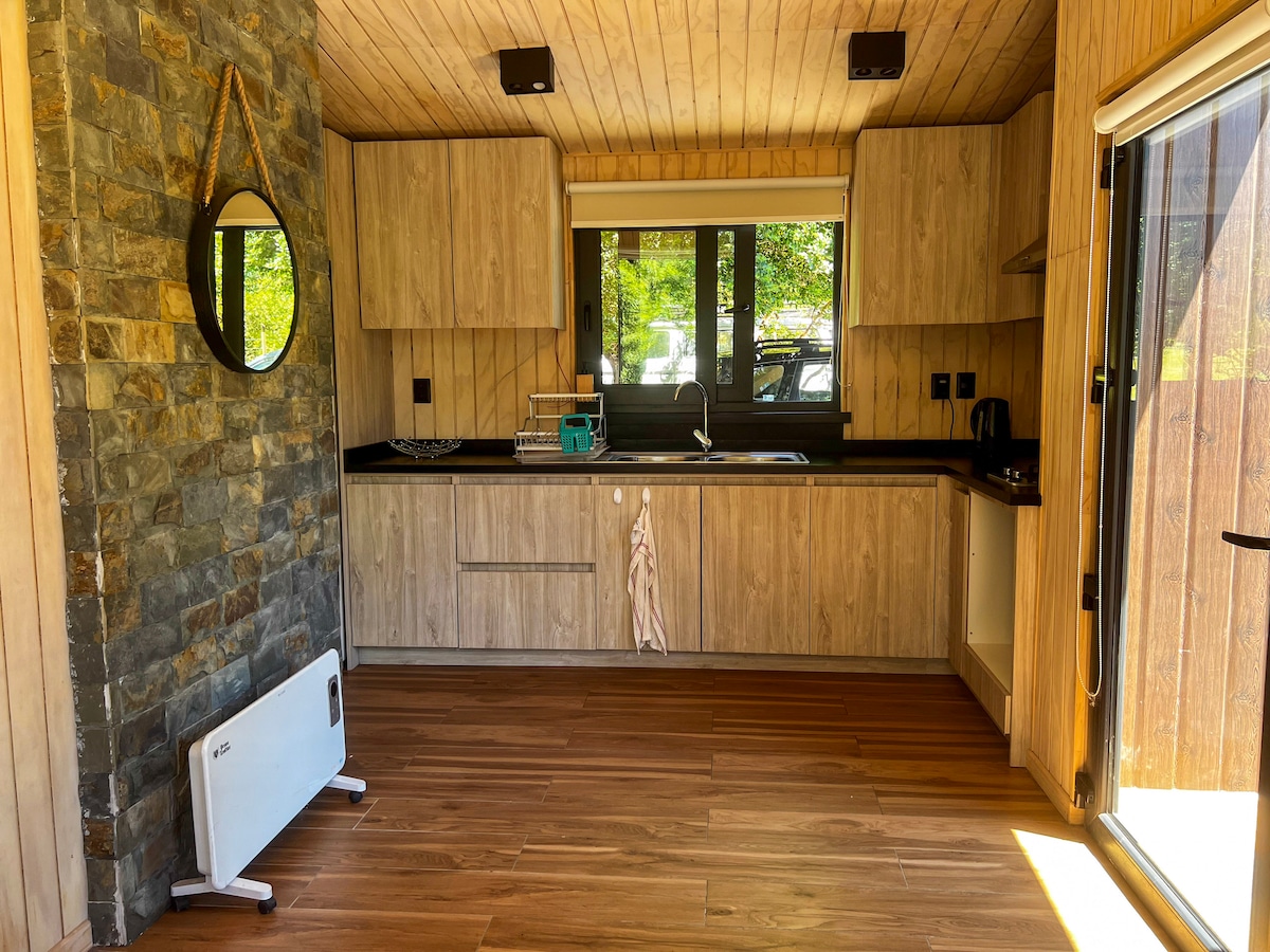 Slakaðu á í þessu einstaka og rólega fríi með gríðarlegu útsýni yfir Villarica. Aðgangur að öllum gerðum ökutækja. Skálinn er nýr og af mjög háum gæðum, búinn öllu. Dvöl þeirra felur í sér afnot af einka gufubaðinu okkar í skóginum við hliðina á læk. Staðsetningin er 18 km frá Pucón, 1 km frá Ojos de Caburgua. Það er fullkominn staður til að njóta hreinnar náttúru, við höfum >25 tegundir fugla innifalinn. Það er einnig tilvalið til að komast í burtu frá borginni og vinna lítillega.