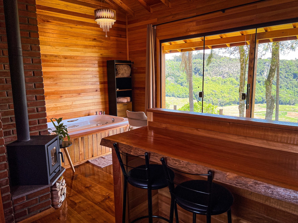 Slakaðu á í þessu rólega og stílhreina rými þar sem stórkostlegt útsýni yfir fjöllin blandast við tónlist fossins. Einkaréttur: Njóttu einu kofans á 30.000 m² einkasvæði. Seu Empíreo Retiro í hjarta náttúrunnar. Aukaupplifun: Bókaðu afslappandi nudd hjá nuddara sem kemur í bústaðinn. Það er dásamlegt! Húsið er byggt úr grófum við og skreytt með fágun til að veita ógleymanlega, fágæta og notalega upplifun.