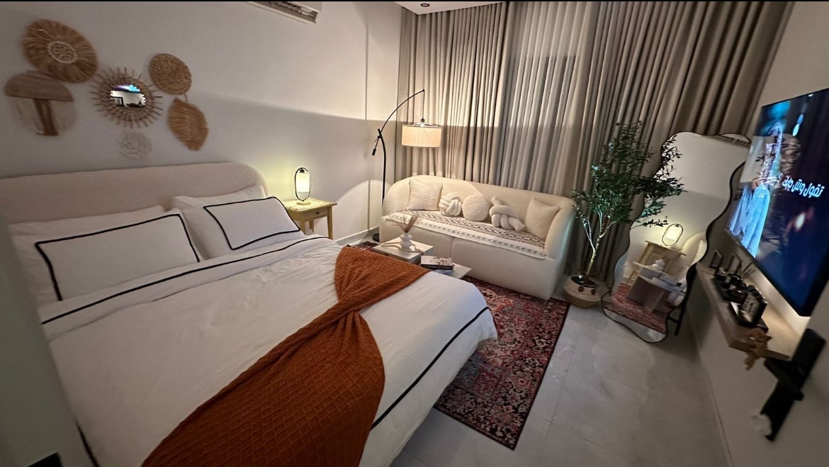 Lúxusíbúð með hótelstemningu Svefnherbergi og stofa með glæsilegri hönnun og nýjum húsgögnum sem veita þér mikil þægindi og sérstaka dvöl. Trefja internet og snjall aðgangur fyrir auðveldan aðgang og fullkomið næði. Góð staðsetning og nálægt öllu: • 7 mínútna fjarlægð frá flugvellinum • 3 mínútur frá Mall of Arabia Fullkomið val fyrir þá sem leita að þægindum, lúxus og sérstakri staðsetningu