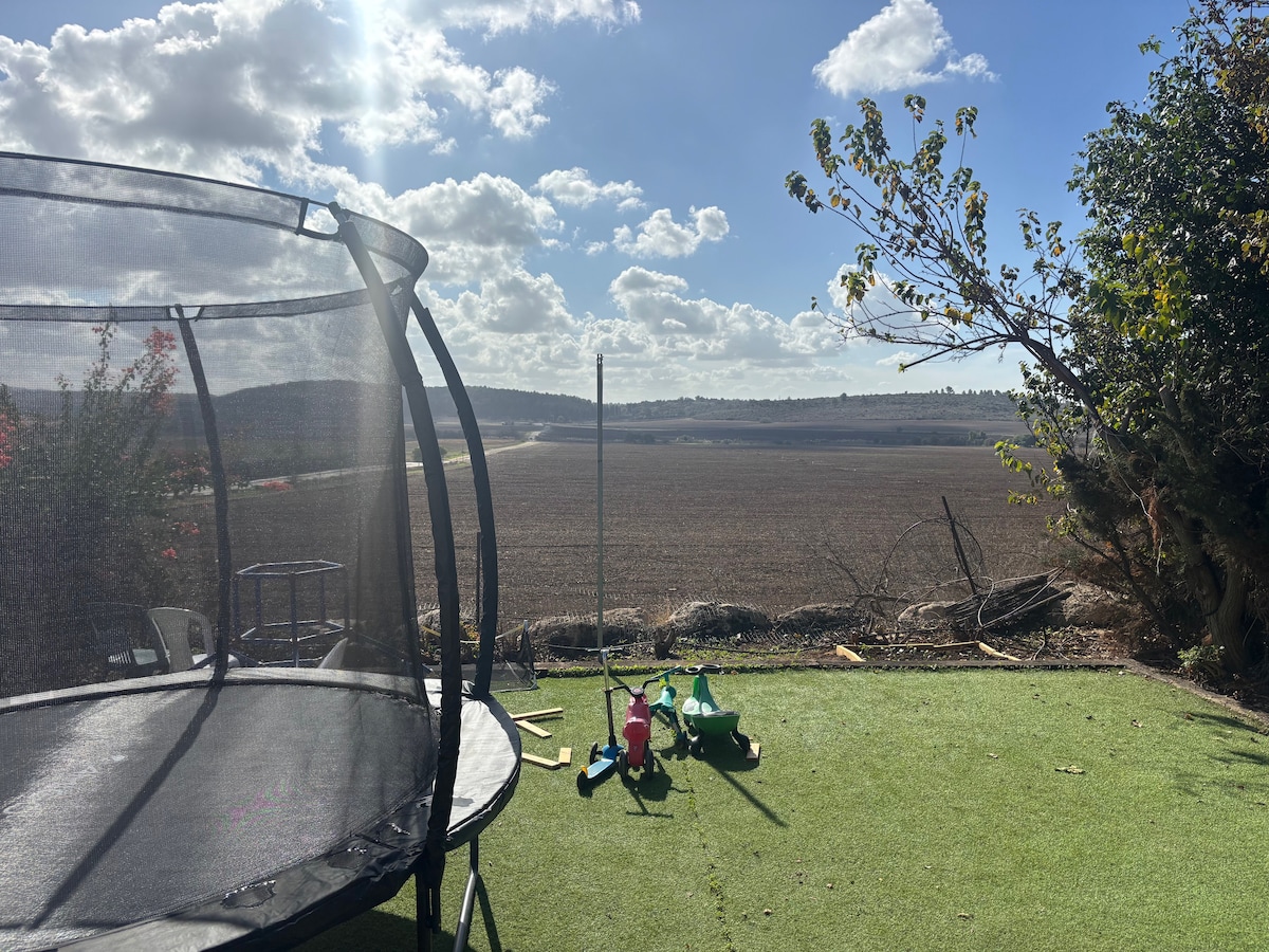 Gistu í lúxusheimili mínu með þremur svefnherbergjum í rólegu þorpi í miðborg Ísraels með 6 metra háu lofti og einstakri blöndu af flottri popplist og gömlum skreytingum. Njóttu útsýnis yfir sólarupprásina frá aðalsvefnherberginu og sólsetrinu frá yfirgripsmiklu veröndinni með nuddpotti og útisturtu. Inniheldur fullbúið eldhús, barnaherbergi með kojum, öruggt herbergi (mamad) með vinnu- og leiksvæði, hratt þráðlaust net, Netflix, þvottavél og þurrkara. Fullkomið fyrir þá sem vilja þægindi og stíl!