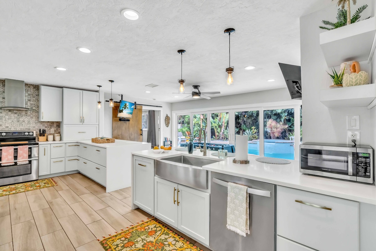 High end, luxury 3/2 pool home! 7 4k TVs w/ Netflix and cable (75" in living room), SONOS throughout house/pool, wifi, PS5, private heated salt water pool/Spa, putt putt, foosball, beach gear, Pack & Play, Game room (board games, billiard, shuffle board, arcade), massive kitchen/bar, washher & dryer, garage parking-- all in a quiet and safe neighborhood. Aðeins 5 mílur að bestu ströndunum og veitingastöðunum. Allt heimilið án sameiginlegra þæginda!