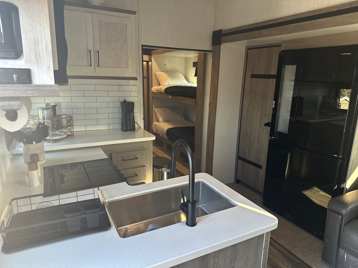 Slappaðu af í fullkominni blöndu af lúxusútilegu og þægindum í þessum glæsilega húsbíl sem rúmar 7 gesti og er með 1,5 baðherbergi. Pantaðu mímósu (eða 2!) áður en þú hoppar á vagninum til víngerðarhúsa og brugghúsa í nágrenninu til að smakka og skemmta þér. Og þegar nóttin rennur niður skaltu njóta glæsilegs útsýnis yfir sólsetrið frá einkasetusvæði utandyra með eldgryfju og bjóða upp á snarl fram á nótt og kokkteila með barþjóna sem eru afhentir heim að dyrum til klukkan eitt (því frábærum nóttum þarf ekki að ljúka snemma!).