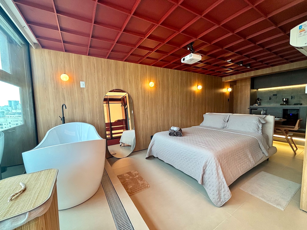 Stúdíóið er staðsett á 31. hæð í hæstu byggingunni í miðborginni með nútímalegri og notalegri hönnun ásamt tilkomumiklu útsýni yfir borgina. Frá glugganum getur þú dáðst að Anhangabaú-dalnum, sögulega miðbænum og loftnetunum í Av. Paulista: eitt fallegasta landslagið í São Paulo. Þetta er byggingin þar sem SampaSky er staðsett og það er hægt að ganga að helstu áhugaverðum stöðum miðborgarinnar. Hér er loftkæling, 55'' sjónvarp með öppum, eldhús með nauðsynlegum áhöldum, eldavél (1 munn), örbylgjuofn og minibar.