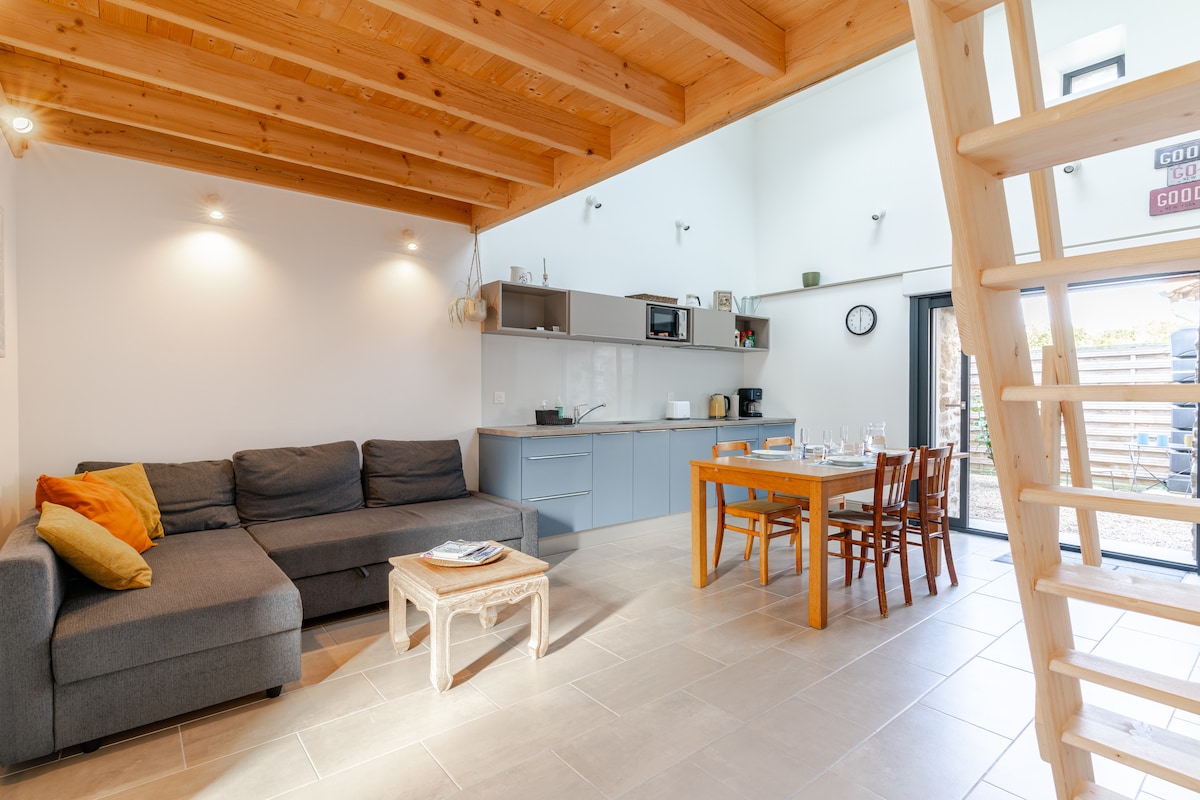 lítið nýuppgert sjálfstætt hús staðsett í Bouguenais Bourg, fullkomlega staðsett (5 mínútur frá Nantes atlantiques flugvellinum, bein Nantais hringvegur aðgangur, 15 mínútur frá Nantes miðborg, 30 mínútur frá Pornic, verslunum í nágrenninu osfrv.). Þægileg , hljóðlát og fullbúin gisting. Eitt svefnherbergi með 140 rúmi og fataherbergi_innréttað eldhús_ baðherbergi með sturtu og WC _ access garden _ wifi _ borðstofa og slökunarsvæði_ möguleiki á flugrútu við aðstæður