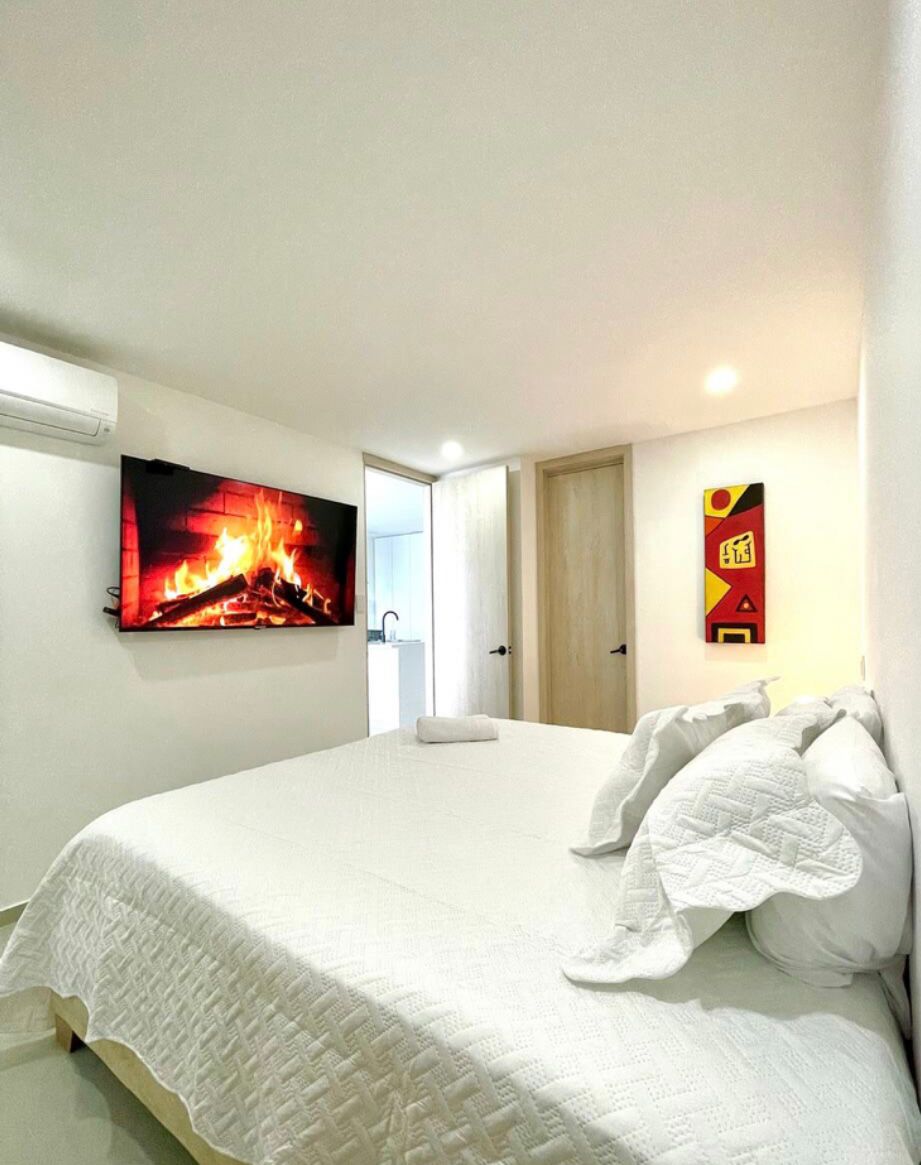Þægileg og falleg íbúð með 2 svefnherbergjum, hvert með fataherbergi, sérbaðherbergi og AA. Aðalherbergi með hjónarúmi (annað hjónarúm fyrir neðan) og aukaherbergi með 2 einbreiðum rúmum (önnur 2 einbreið rúm fyrir neðan). Fullbúið eldhús. Stofa og stúdíó með AA. Háhraða þráðlaust net og kapalsjónvarp 3 Snjallsjónvarp. Bygging með sundlaug og líkamsrækt. Öruggt svæði. Athugaðu að þú verður að senda gögnin þín fyrir innritun (kólumbísk lög).