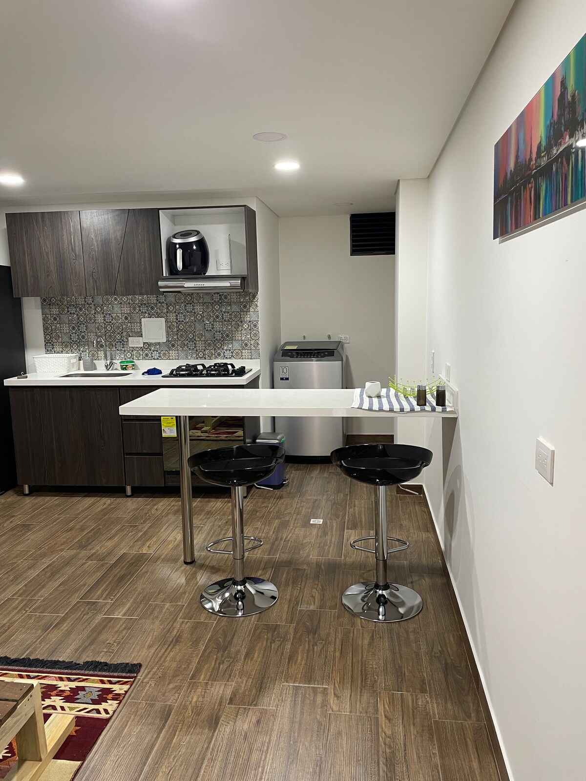 Íbúðin er einni húsaröð frá þeirri sjöundu, við hliðina á carulla stórmarkaðnum, þar eru tvö rými (svefnherbergi og félagssvæði), eldhúsið er með öllu sem þú þarft fyrir dvöl þína, við erum með smarttv svo þú getir notið uppáhalds kvikmyndanna þinna og þáttaraða. Auk þess að hafa veitingastaði og krár eina húsaröð í burtu sem hafa ekki áhrif á þig í hávaða vegna staðsetningar íbúðarinnar í byggingunni. Baðherbergið er rúmgott, stór skápur og heitt vatn allan sólarhringinn!