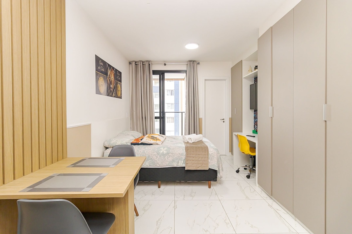 Falleg íbúð staðsett í hjarta borgarinnar. Nálægt bóhemhverfinu Batel er þessi staðsetning með fullt af verslunum og verslunarmiðstöðvum eins og Shopping Crystal og Shopping Pátio Batel, Rua 24 horas. Hún er tilvalin fyrir tvo og er með stofu/borðstofu, eitt svefnherbergi, fullbúið baðherbergi og fullbúið eldhús. Eignin telst einnig með: þráðlausu neti, snjallsjónvarpi, heitu og köldu loftræstingu, heitu og köldu vatni í eldhúsinu og á baðherberginu. Við útvegum rúmföt og baðhandklæði.