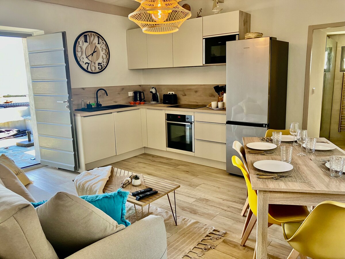 300 m frá höfninni og sjávarsíðunni, heilt, bjart og loftkælt heimili sem opnast út á rúmgóða verönd með sjávarútsýni. Loftkælda heimilið býður upp á öll þægindi með mörgum þægindum. Hátíðarskreytingar með mjúkum litum og pastel. Nýtt, coquettish heimili. Bílastæði eru ókeypis, fyrir mótorhjól, hjól eða bíla í hliðinu og undir eftirliti. Skráningar eru með ókeypis nettengingu.