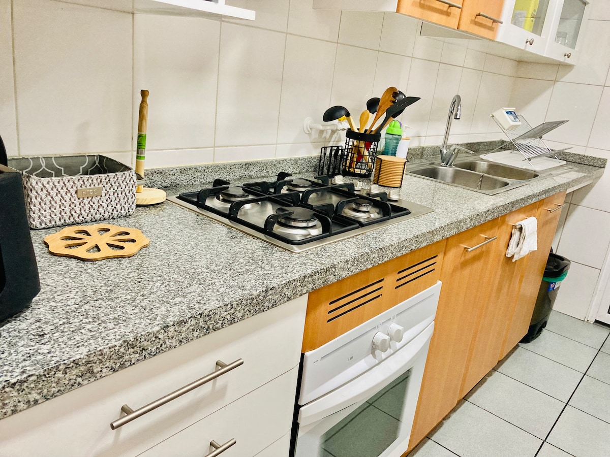 Njóttu þessa heimilis steinsnar frá Las Condes Clinic, Leader matvörubúðinni, Alto las Condes-verslunarmiðstöðinni, krám og veitingastöðum. Frábært aðgengi að vegum og flutningum! Mjög notalegt, fullbúið með getu til að taka á móti allt að 4 manns. Svefnpláss fyrir 2 og futon fyrir 2. Fullbúið eldhús, baðherbergi með baðkari, hitaspjald (kalt og hávaði einangrað) og rík verönd. Rafmagnshitun, þráðlaust net og sjónvarp. Það er með sundlaug, sameiginleg rými, þaksvalir, fjölnota herbergi og þvottahús. PETFRIENDLY