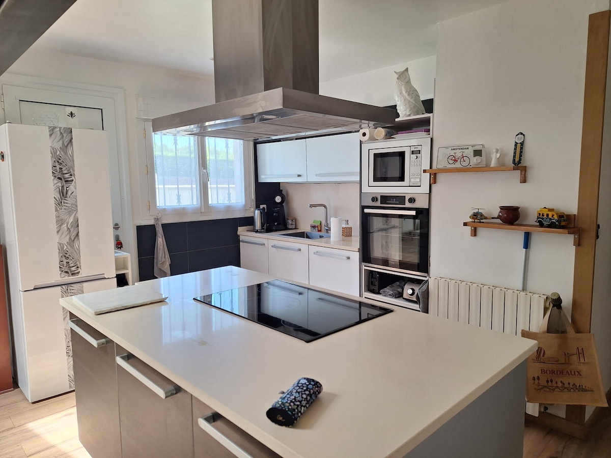 Endurnýjað hús staðsett í hjarta vínekrna Bordeaux, í 35 mínútna fjarlægð frá Bordeaux (20 mínútur með lest), 15 mínútum frá Libourne, 20 mínútum frá Saint-Émilion og í um 1 klukkustund og 20 mínútna fjarlægð frá ströndunum (Dune du Pilat, Arcachon). Svefnpláss fyrir 4, stofa með fullbúnu eldhúsi, svefnherbergi með hjónarúmi og skrifborði. Baðherbergi við hliðina á svefnherberginu. Aðskilið salerni. Húsið er með stóra, húsgagnaðri verönd með grillplötu og sólstólum til að njóta fallegra kvölda. Lestarstöðin er í 15 mínútna fjarlægð.