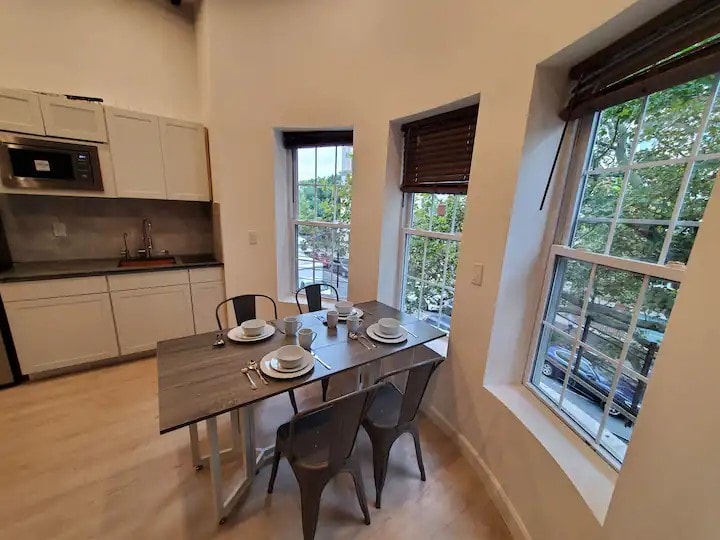 Verið velkomin á The Mark þar sem sögulegur sjarmi mætir nútímalegum lúxus í þessu risastóra stúdíói í Brooklyn. Hér eru upprunalegar upplýsingar um gull, svífandi loft og útsýni yfir almenningsgarðinn í gegnum glugga sem ná frá gólfi til lofts. Þetta miðlæga heimili blandar saman gömlum glæsileika og nútímaþægindum. Njóttu nýuppgerðrar heilsulindar eins og baðherbergis, eldhúss úr ryðfríu stáli og fágætra glersáma, allt á móti hljóðlátum almenningsgarði sem er fullkominn fyrir gæludýr og friðsæla en stílhreina gistingu.
