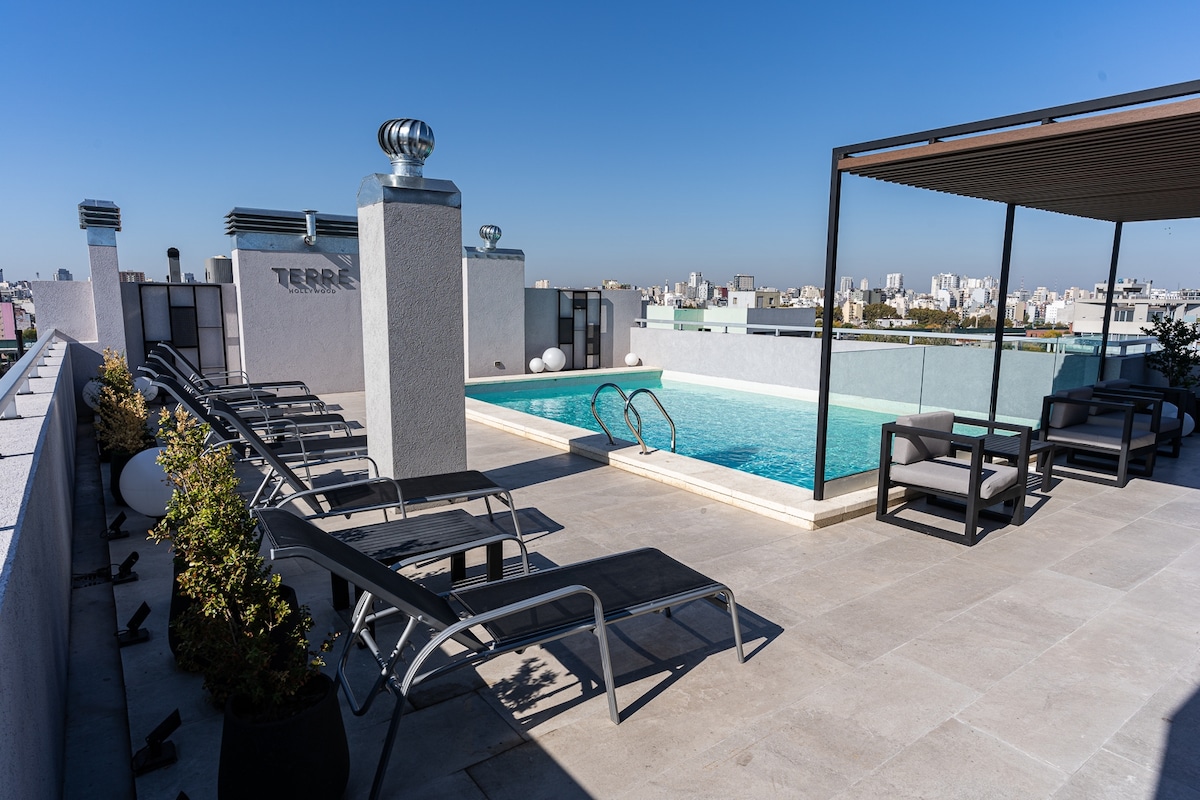 Stórkostleg íbúð, rúmgóð og björt með einkaverönd, sundlaug og grilli. Fullbúið og skreytt til að gera dvölina eins ánægjulega og mögulegt er. Gististaðurinn er staðsettur á efstu hæð í nútímalegri byggingu í Palermo Soho, einu öruggasta svæði með miklu matar- og menningarlegu aðdráttarafli. Tilvalið fyrir pör sem vilja ró, þægilega hvíld og njóta ótrúlegrar verönd með fallegu útsýni.