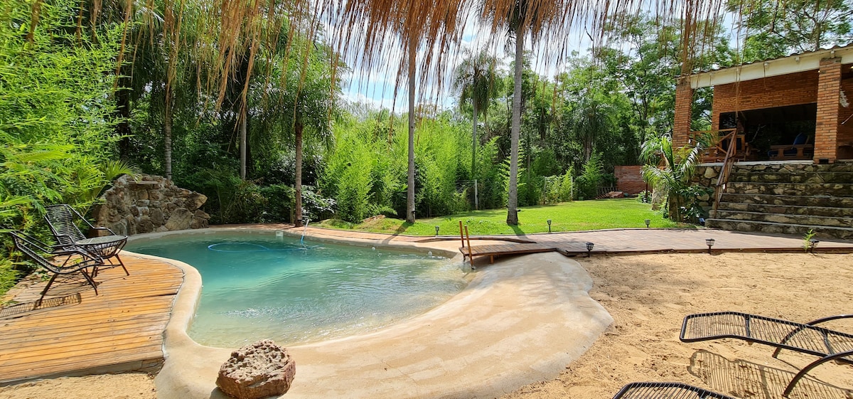 Tilvalið að slaka á með allri fjölskyldunni og vinum á þessum kyrrláta stað sem er umkringdur grænum svæðum. - Jarðhæð: Þar er sundlaug, nuddpottur, opið quincho, grill, arnar, stór verönd, tatacuá, tvö baðherbergi og félagssvæðið sem er innbyggt í eldhúsið/borðstofuna. - Efri hæð: er með tveimur svefnherbergjum, öðru með hjónarúmi (og öðru til viðbótar), hitt er með 2 tvíbreiðum rúmum (auk tveggja til viðbótar) og sameiginlegu baðherbergi. Aðeins 200 metrum frá Country Club SB. Gakktu til Pirayu'i.
