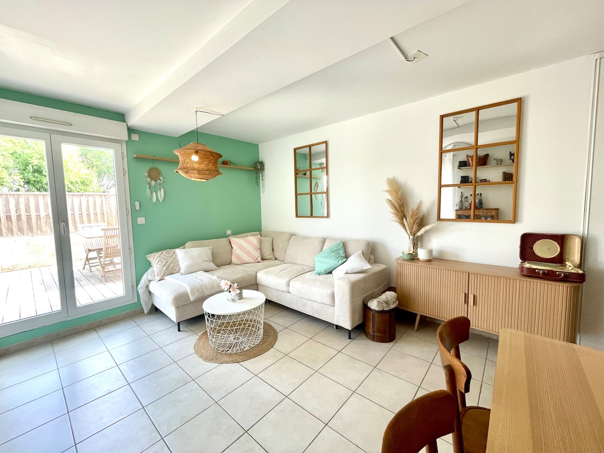 Gistingin þín í einka- og hlöðnum garði er staðsett í hjarta þorpsins Priay, meðfram ánni Ain (sund, fiskveiðar, kanósiglingar) og 5 mínútur frá Golf de la Sorelle. Það samanstendur af móttökusal, fullbúnu eldhúsi, svefnherbergi með 1 hjónarúmi (mögulegt 2 að beiðni), sturtuherbergi, yfirbyggðri verönd um 40 m². 1 bílastæði og hleðslustöð. Í jafnri fjarlægð milli Lyon og Genf skaltu njóta margra ferðamannastaða.
