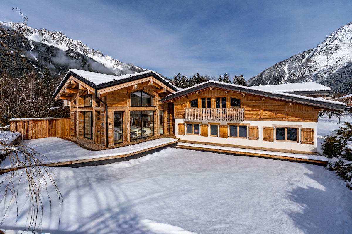 Verið velkomin í Chalet Kyra! Glæný alpaperla staðsett í Chamonix, steinsnar frá miðborginni, með útsýni yfir Mont Blanc Þessi þriggja hæða skáli sameinar glæsileika göfugra efna og nútímaþæginda í hæsta gæðaflokki og rúmar allt að 8 manns í fáguðu og hlýlegu umhverfi Í skálanum eru 4 rúmgóð svefnherbergi, þar á meðal 3 hjónasvítur, með sérbaðherbergi Hvert rými hefur verið hannað fyrir vellíðan þína með nýjum húsgögnum og hágæða áferðum