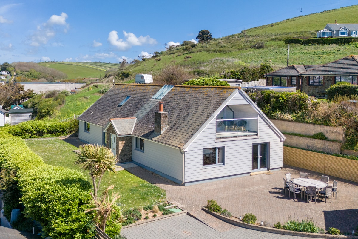 Þetta yndislega orlofsheimili við klettinn er merkilegt vegna einstaks útsýnis frá Burgh-eyju Agatha Christie, yfir Bantham-ströndina og upp að Avon-ánni (leitaðu að „besta útsýninu yfir Bigbury-on-Sea orlofsheimilið“). Þetta er friðsæll fegurðarstaður langt frá umferðinni þar sem þú getur farið í burtu til að fylgjast með sjónum skipta um lit og brimbrettakappa. Eða þú gætir fengið innblástur og tekið þátt í þeim!
