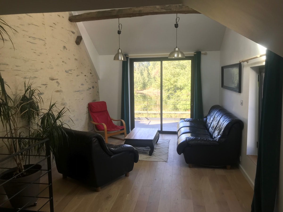 Ertu að leita að afslappandi stund með maka þínum, fjölskyldu eða vinum? Stöðvaðu leitina. Þú hefur fundið hinn fullkomna stað. Staðsett í hjarta græns umhverfis, komdu og njóttu kyrrðarinnar í sveitinni og nálægðarinnar við borgina. Bústaðurinn er við vatnsbakkann og er fullkominn staður til að kynnast Anjou. Göngufólk, íþróttafólk og fiskimenn hafa aðeins skref til að komast að bökkunum og dráttarstígnum áður en þeir slappa af í þriggja sæta heitum potti.