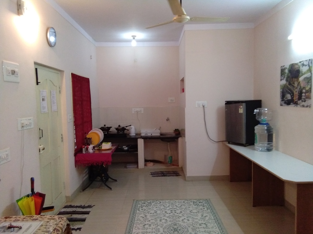 Best Place to visit with family and kids. 1-2 couples can accommodate to this great place with Spacious Living Area, A bathroom and Kitchen. Property is surrounded with greenary and enjoy the stay with cool breeze. All major tourist attractions places are hardly few meters from proeperty - Zoo 500 meter - Mysore palace 1 km - Mall of Mysore 500 meter - Aqua world 200 meter - Chamundi Hill 3 kms - Snow World 500 meter.