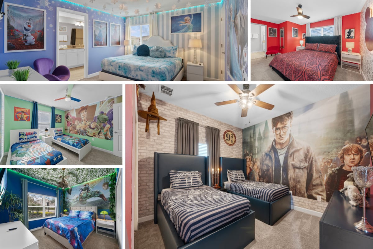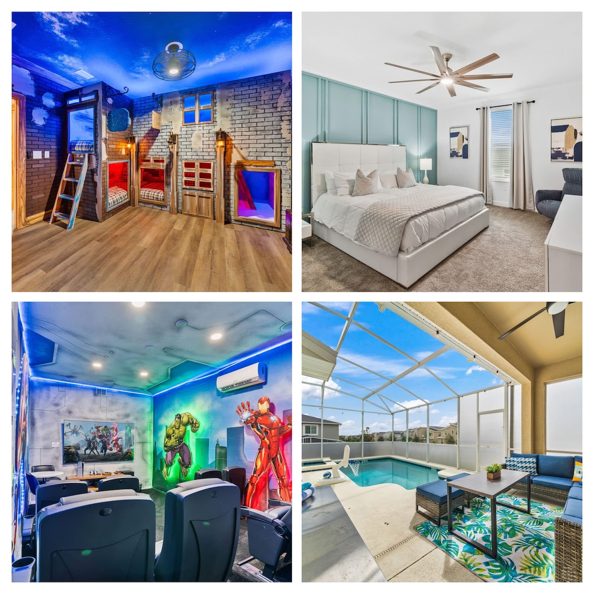 Þetta stórkostlega heimili í einkasvæðinu Reunion Resort býður upp á ógleymanlega fjölskylduskemmtun, aðeins nokkrar mínútur frá Disney. Stígðu út á 223 fermetra sólpall með sundlaug sem snýr suðvestur með útieldhúsi, einkasundlaug, nuddpotti og engum nágrönnum fyrir aftan—fullkomið fyrir sólböð allan daginn og sund við sólsetur. Innandyra: Einkakvikmyndahús, billjardspilastofa og stórkostleg svefnherbergi með Star Wars og Frozen II þema með rörrennibraut ásamt Xbox og PlayStation fyrir endalausa skemmtun.