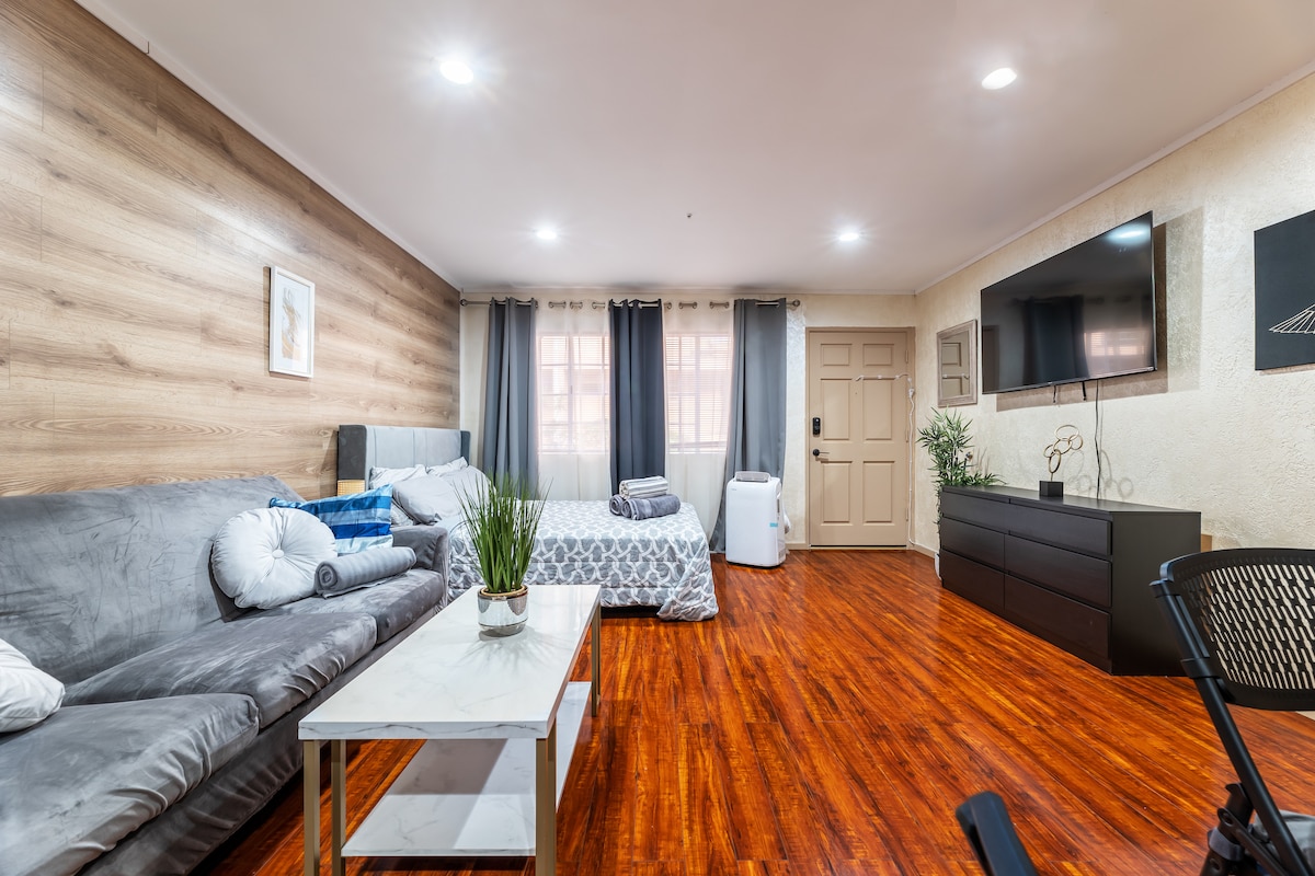 Kynnstu þægindum litla húsnæðisins í nýuppgerðri stúdíóíbúð okkar í hjarta Glendale 🌸 Hannað fyrir afslöngun og stíl — njóttu lífrænnar dýnu í queen-stærð, hraðs Wi-Fi, snjallsjónvarps með Netflix og fullbúins eldhúss. Slakaðu á við stóru laugina eða skoðaðu The Americana, Glendale Galleria, Griffith Park og Universal Studios — allt í nokkurra mínútna fjarlægð. Örugg bílastæði eru innifalin án endurgjalds 🚗✨