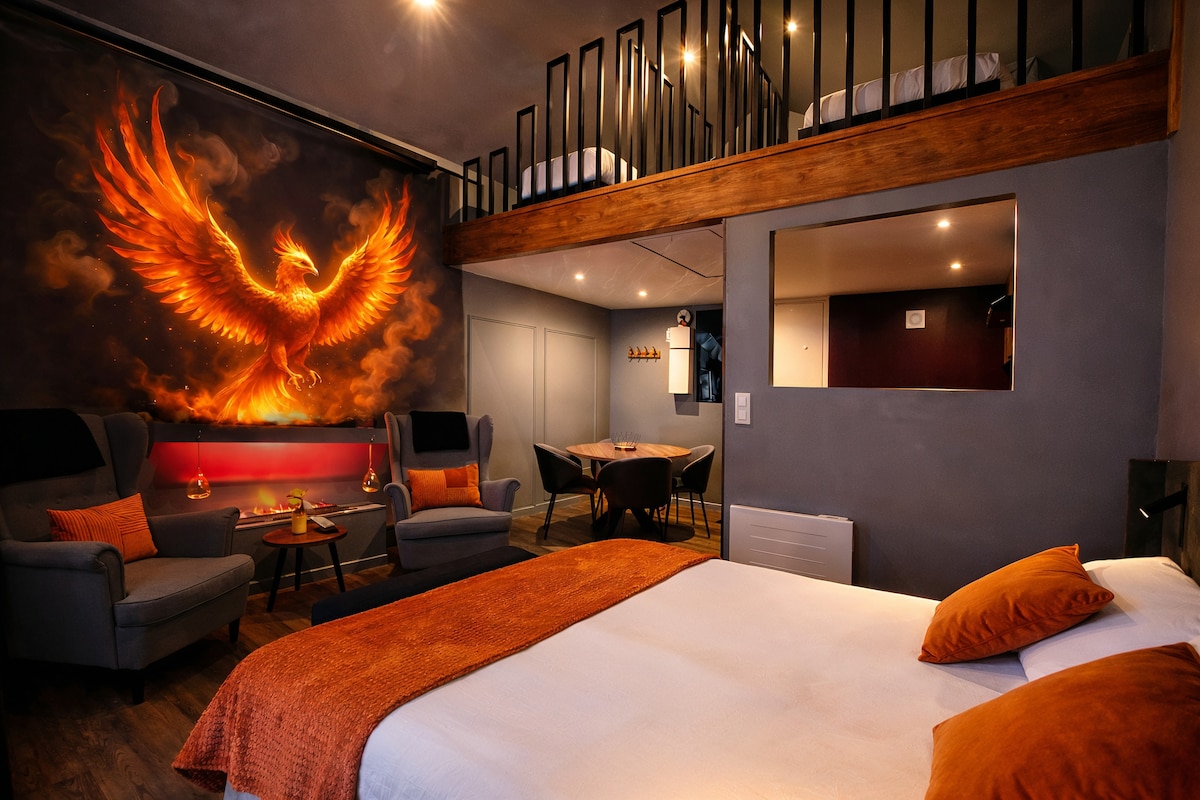 L'endroit idéal pour vos soirées "Chill" Imaginez-vous lové dans un graaand lit confortable, une poignée de popcorn, des chocolats ou quelques friandises sucrées à portée de main, absorbé par un grand écran diffusant vos films, séries et chaînes préférés via toutes les plateformes de streaming. Dans la Suite Phoenix, chaque instant devient une parenthèse de douceur et de chaleur. Avec la lueur dansante de la cheminée, vous êtes au cœur d’un cocon parfait.
