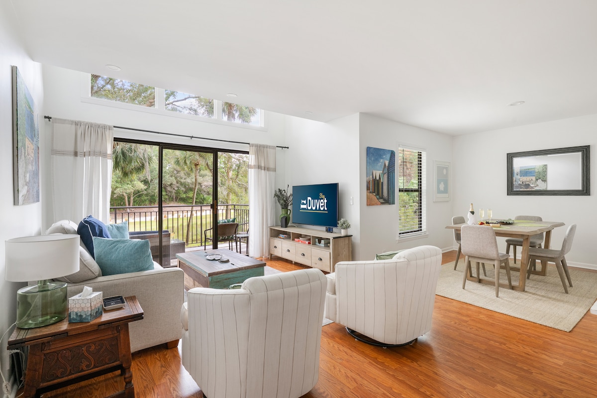 Clean and fresh beach decor. 950 sq ft "treehouse" on beautiful Seabrook Island with lots of extras. Huge floor to ceiling doors and windows that overlook a beautiful lagoon with wildlife galore. Gaze outside for hours and view amazing birds, deer, fish, turtles, and even an alligator or two! Large deck with seating for six. WiFi and three smart tvs. Seabrook Island Business License # BL25-001955. STR permit #STR25-000600 MAXIMUM 2 VEHICLES