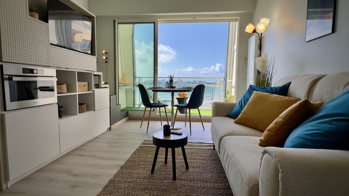 🏡 Kostir þessa þægilega 32 m² stúdíós með svölum: 🏖️ Ótrúlegt útsýni! 🛏️ King-size rúm með útsýni yfir stóra bláa litinn 🤩 🌊 Strönd og Thalasso Spa innan 5 mín göngufjarlægðar 🚙 Bílastæði innifalið! 🍽️ Fullbúið, endurnýjað og smekklega endurnýjað fyrir sumarið 2025 🍽️ Allt innifalið: rúmföt og handklæði ásamt „nauðsynjum“ fyrir komu: sturtugel, sjampó, kaffi, te, olía, salt, pipar 💻/ Free🍼 equipment: baby (bed, bathtub, chair), computer screen, etc.