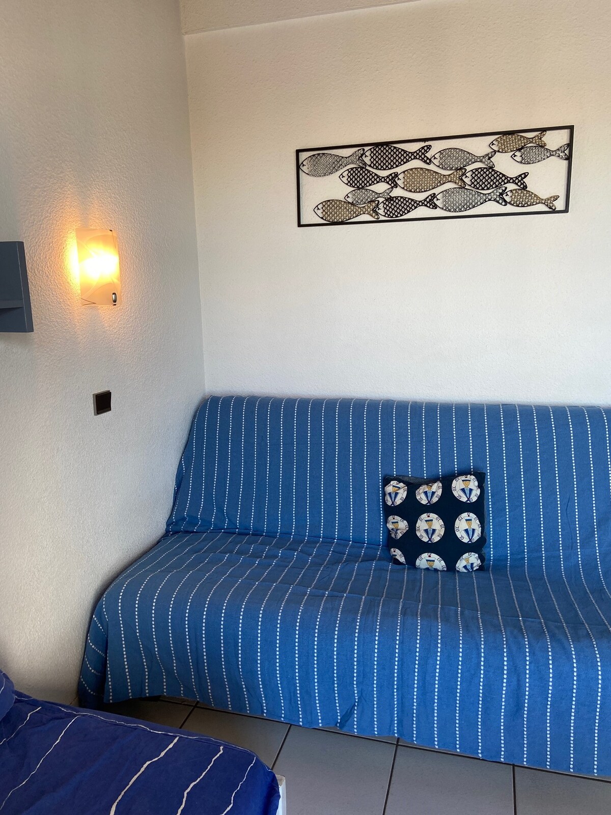 L’appartement est doté d'une terrasse couverte (c'est le plus, car protégée du vent si besoin) et très bien ensoleillée dés le levé du jour; la terrasse est équipée de mobilier de jardin... (5 chaises et un fauteuil) Descriptif de l'appartement : A) 1 chambre avec un lit mezzanine comprenant: 1 couchage 2 p, 1 couchage 1 p, et 1 matelas d'appoint pour 1 p B) Un espace séjour cuisine, avec balcon offrant une vue "mer" incomparable C) Une salle de bain avec douche (étroite 70cm) et WC