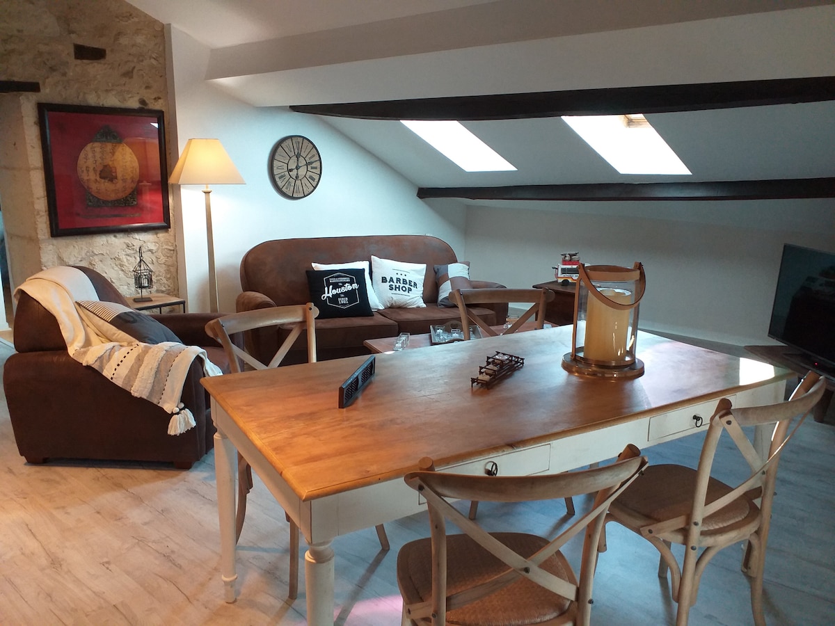 Charming loft/duplex (120 m2) in an old renovated farmhouse in the heart of Périgord-Dordogne. Settled on the top of a quite hill, surrounded by 10 ha with orchard, vegetable garden, meadows and woods overlooking the valley and village. Private outdoor areas. Wood heating. Saltwater overflow swimming pool (70 m2). High band internet. 30mn/Bergerac vineyards, 1hour/prehistoric sites (Lascaux). Easy access (10mn/highway, 1h/Bordeaux airport). Artist studio on request. Winter long term welcomed.