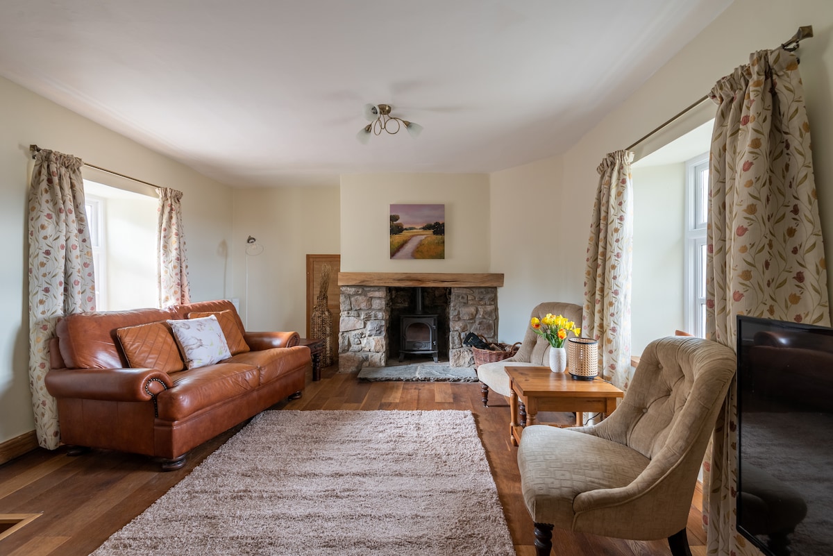 Dolly 's Barn er gæludýravæn, björt og rúmgóð eign á einni hæð sem hefur verið umbreytt úr gamalli steinbyggingu. Frábært útsýni og við hliðina á reiðtjaldi sem hefur verið endurbyggt að villtum blómaeng. Þreföld atriði með log-eldavél og upphitaðri miðstöð. Sólarplötur. Rafmagnsbílahleðslutæki í boði. Þar sem þetta er staðsetning á landsbyggðinni getur verið erfitt að fá merki um þjónustuveitanda þinn.