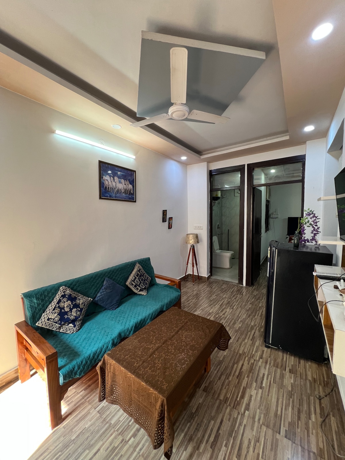 Staðsett í hjarta suðurhluta Delí @GK 1. Við bjóðum ykkur velkomin á auðmjúka heimilið okkar. Þetta litla rými er hannað með stúdíói fyrir þá sem elska pláss og næði og hefur allt það sem þú þarft fyrir stutta og langa dvöl. Hér er lítið en vel búið eldhús og baðherbergi. Með glænýrri Panasonic Split Ac uppsettri árið 2025 Lykilatriði til að hafa í huga er inngangurinn sem er í gegnum hringstiga frá bakhlið hússins okkar sem er mjög miðsvæðis með hlaupagarði og hundagarði í nágrenninu