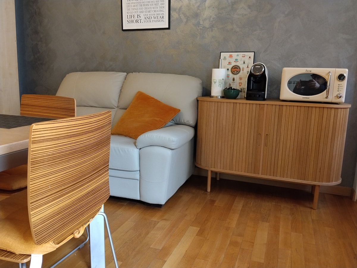 Við elskum að taka á móti gestum og gera dvöl þína einstaka með góðvild og brosi. Notaleg íbúð í íbúðahverfi, björt viðargólf, uppþvottavél, þvottavél, loftkæling, þráðlaust net og fullkomið hreinlæti. Strætisvagnastöð til Feneyja í 300 metra fjarlægð: í 45 mínútna fjarlægð. Lestarstöð í 2 km fjarlægð, ókeypis bílastæði, lestin nær til Feneyja á 20 mínútum. Ef þú keyrir sjálf/ur er tilvalið að heimsækja Treviso og Padua með Autostrada í 3 km fjarlægð. Fyrir barnavagna í boði.