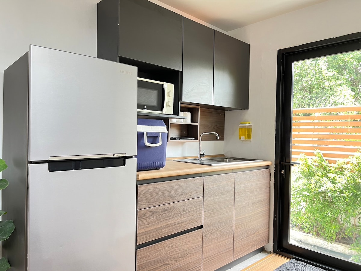 - Rúmgott herbergi upp að 33 fermetrum - Inngangur við veginn niður að Bangsaen-strönd, á móti hliði Burapha-sjúkrahússins, er hægt að leggja við íbúðina og fara á tveggja hæða bíl til að fara hvert sem er, mjög þægilegt. - Það er kaffihús með 7-Eleven og Amazon í sömu hlið íbúðarinnar og í þægilegri göngufjarlægð - nærri stærstu verslunarmiðstöðinni í Bangsaen og Wangjak-helgarmarkaðnum. - Bílastæði bæði fyrir inni- og útisvæði - Nýuppsett Dunloppilo fast rúm - Nýlega uppsett loftræsting - Hljóðlátur og svalur inverter