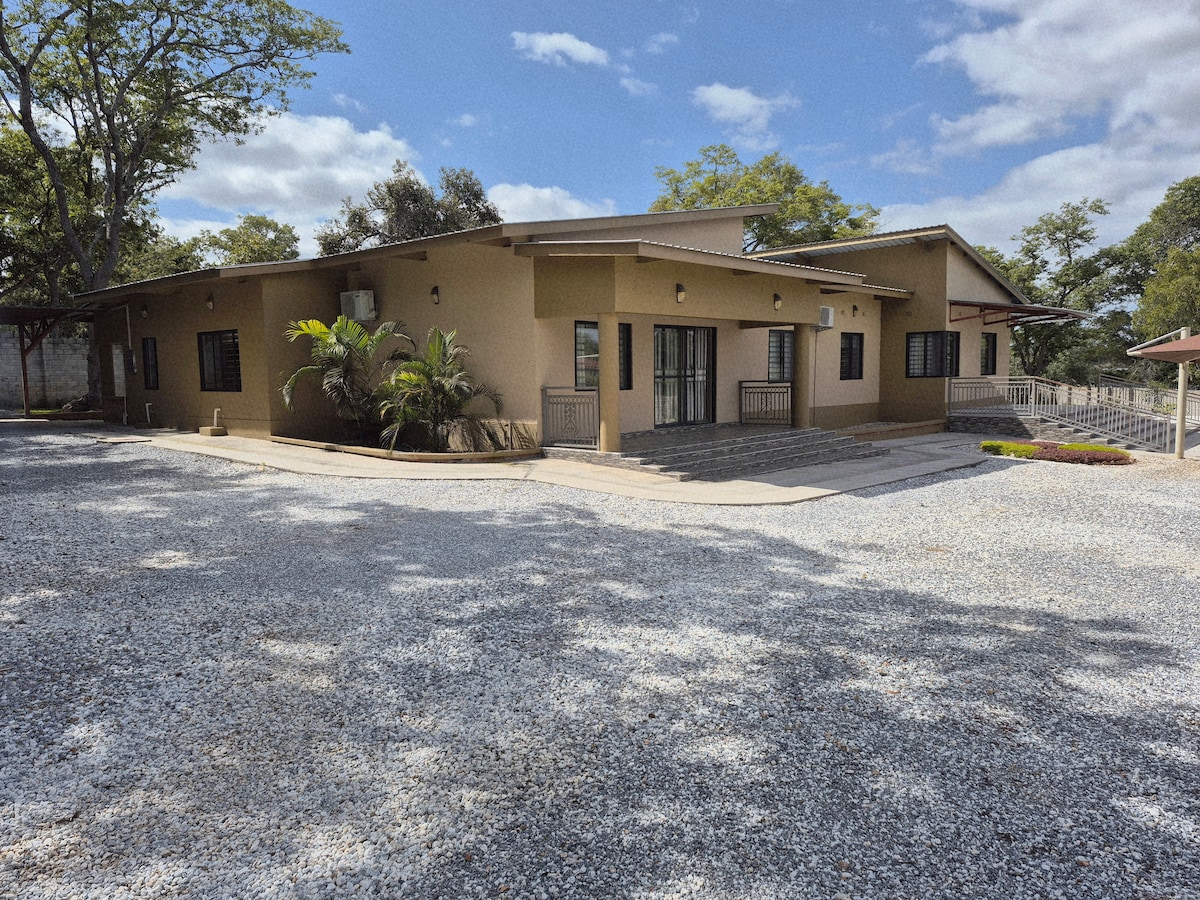 Miðsvæðis, en kyrrlátt, kyrrlátt og rúmgott hús með þroskuðum, gróskumiklum görðum. Njóttu fallegu einkasundlaugarinnar, slakaðu á í garðskálanum, hlustaðu á fuglana og horfðu á stjörnurnar á kvöldin við eldgryfjuna á svölum kvöldum. Í húsinu er starfsfólk að degi til sem getur aðstoðað við að elda máltíðir, þvegið þvott og tryggt að dvöl þín verði þægileg, sólarorka allan sólarhringinn fyrir allar nauðsynjar, þráðlaust net með stjörnuhlekk, hágæða öryggiskerfi og eigin borholu. Aðgengilegt frá Twin Palm eða Great East Road. Nálægt flugvellinum.