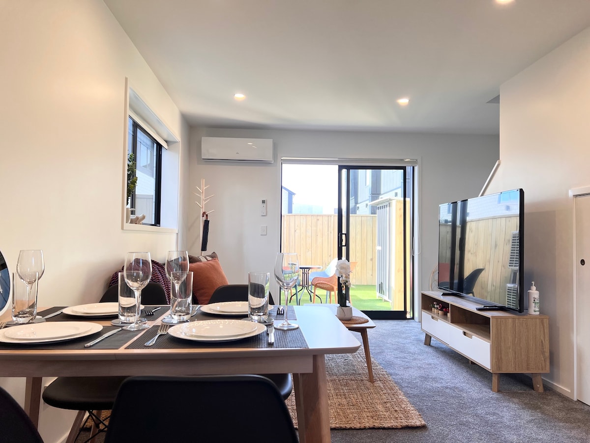 This stunning new townhouse is located in Central Christchurch only an eight minute walk from the Margaret Mahy playground and approximately 10 mins to the CBD. Guests have their own private entrance and use of a fully equipped kitchen washer /dryer. clothes line, bathroom ,Japanese bidet toilet, furnished outdoor area, one bedroom with a queen bed and a sofa bed in lounge.