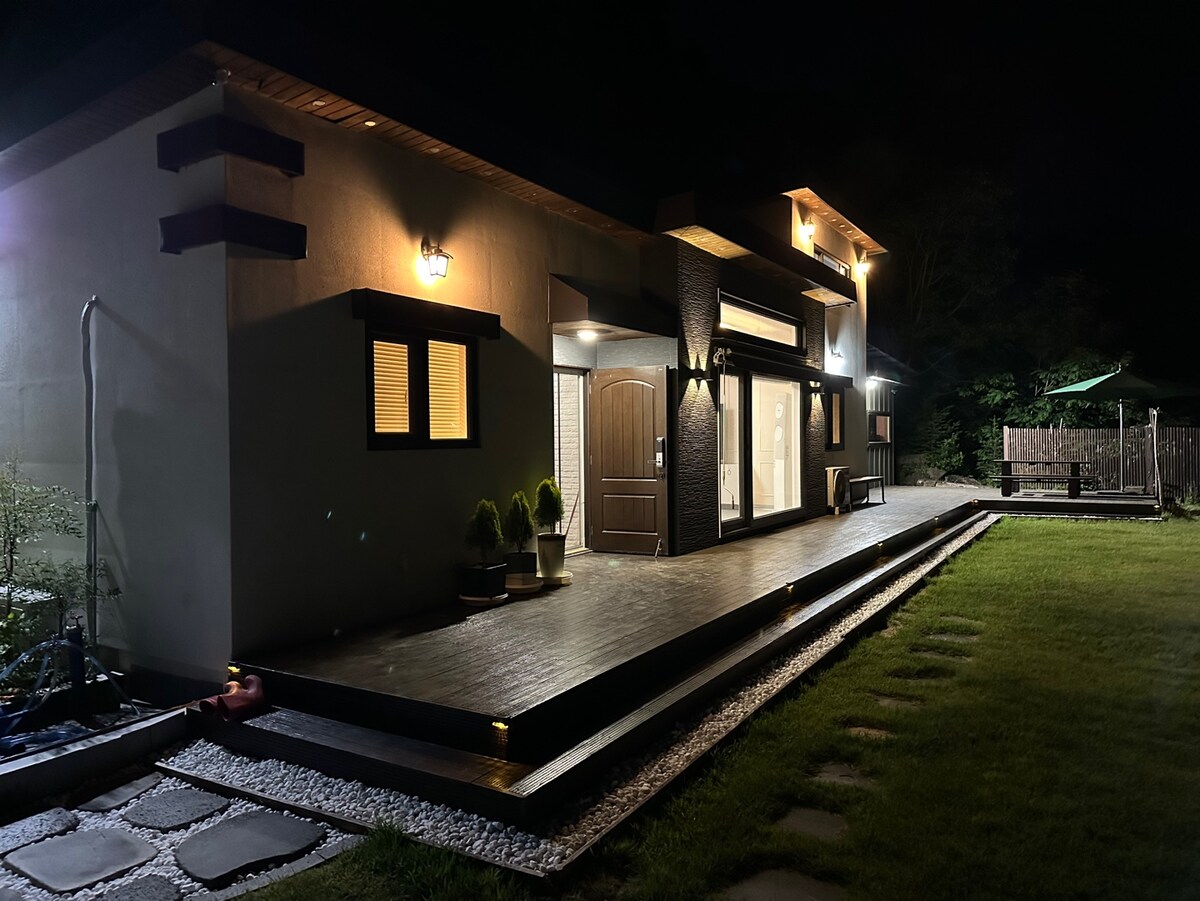 [The Sky's Hidden Arania] Leynilegt heilunarrými þar sem skógurinn og dalurinn mætast Við enda kyrrláta skógarstígsins bíður þín náttúrulegur griðastaður sem er falinn í heiminum. Á einkaveröndinni með skýrum og gagnsæjum leynilegum dal getur þú notið sérstakrar máltíðar með frískandi vatni og ef heppnin er með þér getur þú einnig upplifað óvænta otra. Rúmgóður og blár garðurinn er rými þar sem börn og fjölskyldur geta hlaupið um og hlegið. Í boði er líkamsrækt innandyra og utandyra, æfingasvæði fyrir minigolf, sundlaug, gufubað og sérbaðherbergi svo að þú getur notið hvíldar óháð árstíð og veðri. Fallegi göngustígurinn sem fylgir þegar þú ferð út úr dyrunum og grillveislan í garðskálanum er önnur gleði sem fyllir daginn fullkomlega. Forðastu annasamt daglegt líf og finndu til fulls þeirrar tómstunda og hamingju sem náttúran hefur veitt þér í „Aranya Hidden by the Sky“. Þessi sérstaka eign, sem er undirbúin fyrir þig, verður að síðu ógleymanlegra minninga.