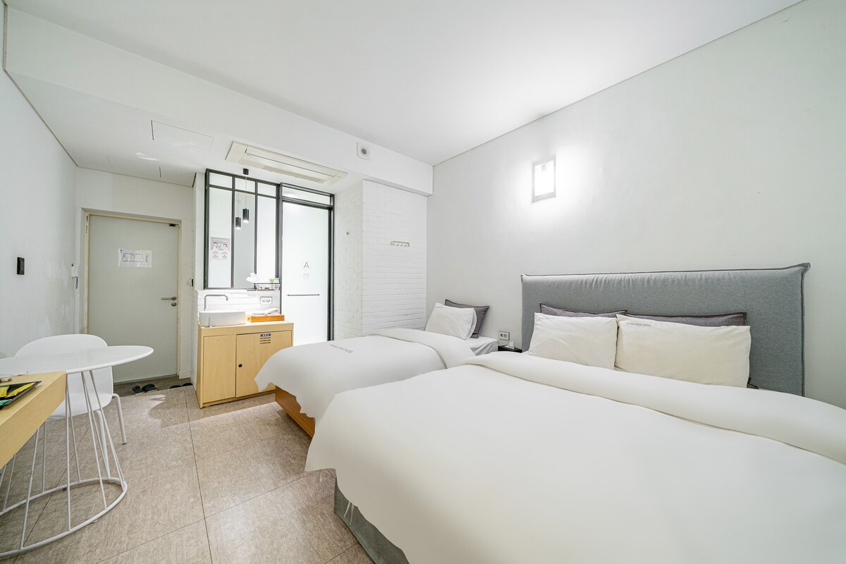 [Reglur um gistipláss] Hefðbundnir 2 einstaklingar/hámark 3 manns Halló, við erum Onda, að rannsaka og bjóða upp á ýmis hvíldarsvæði. Ég vona að allir sem gista hér eigi eftir að eiga notalega og ánægjulega stund. [Kynning á gistiaðstöðu] Byggt á umhyggju, virðingu og samskiptum munum við þjóna hverjum viðskiptavini sem besti gesturinn með úthugsaðri og úthugsaðri þjónustu. Blek, sem fangar sögu Baekje, er staðsett í prinsessu með hundruðum þúsunda alls staðar að. Hótelið hefur einsett sér að veita öllum viðskiptavinum sem heimsækja, allt frá hagkvæmni, athygli og hlýju, hugulsemi og hlýju fyrir hvert og eitt ykkar. [Tegund herbergis] Stúdíó (1 tvíbreitt rúm, 1 einbreitt + 1 salerni)