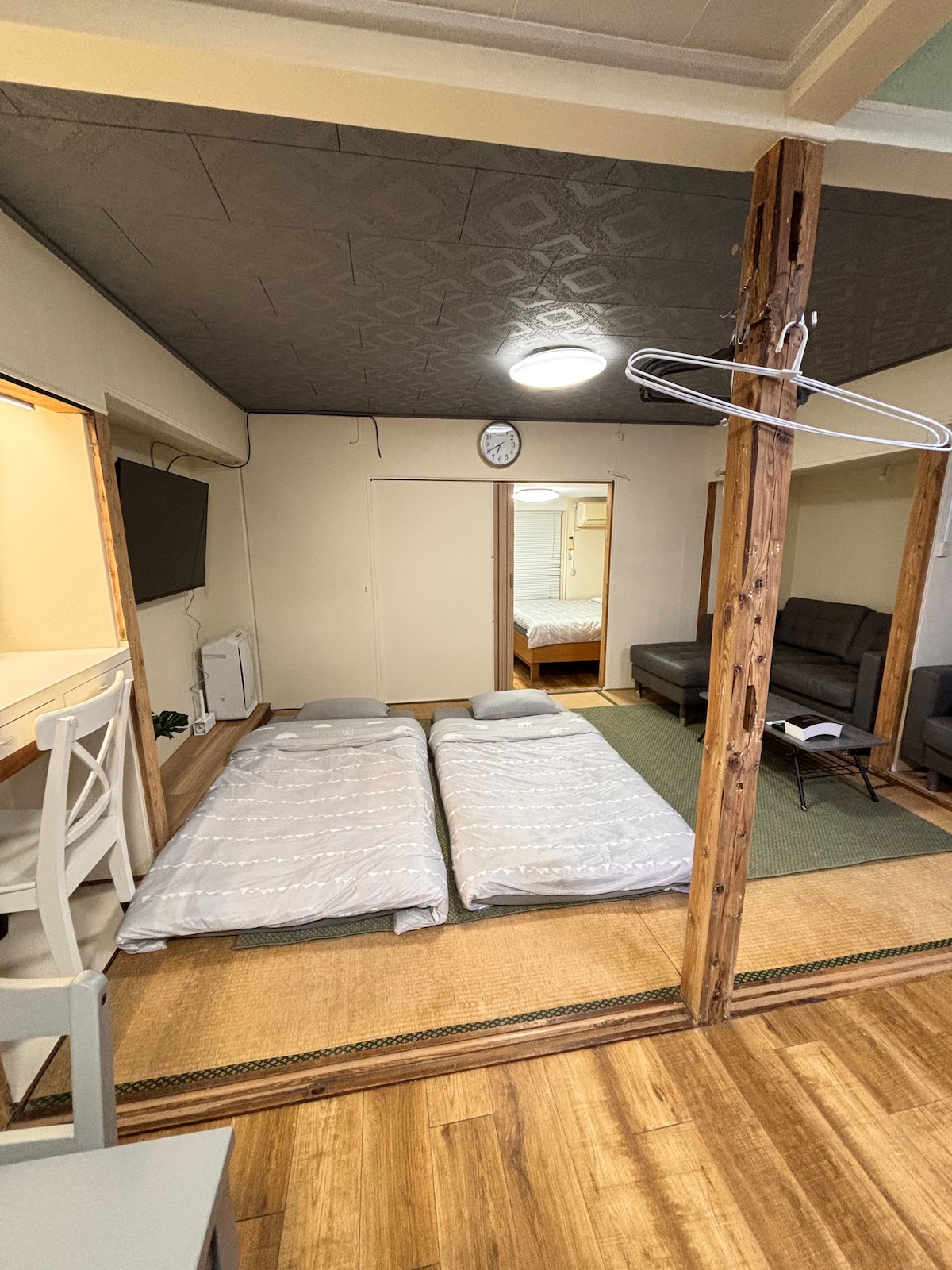 Eftirfarandi tímabil er aðeins heimilt fyrir gistingu sem varir í tvær nætur eða lengur. 2026-04-25 - 05-05 2026-07-17-07-20 2026-08-08~08-16 2026-09-19~09-22 29/12/2026 - 03/01/2027 „ritomaru rooms hakata hakozaki 2nd floor“ Gistiaðstaða fyrir öll gæludýr Frábær staðsetning í aðeins 1 mínútu göngufjarlægð frá JR Hakozaki stöðinni sem er 2 stoppistöðvum frá JR Hakata stöðinni. Þetta er herbergistegundin á 2. hæð. Svefnherbergið rúmar allt að 7 manns með 2 einbreiðum rúmum og 1 hjónarúmi og 3 fútons settum.Svefnherbergið er búið hágæða rúmfötum (Simmons-dýna) fyrir þægilegan svefn og gistingu. Hún er búin öllum heimilistækjum og þægindum og er einnig í boði fyrir þægilega langtímagistingu. Við breytum ekki þægindum, handklæðum, rúmfötum eða þrifum meðan á dvölinni stendur.Vinsamlegast notaðu þvottavél og þurrkara með handklæðum. * Ef þú vilt þrif meðan á dvölinni stendur munum við veita þau gegn gjaldi. * Við bjóðum upp á heimagerð kaffi, svart te og grænt te að kostnaðarlausu.