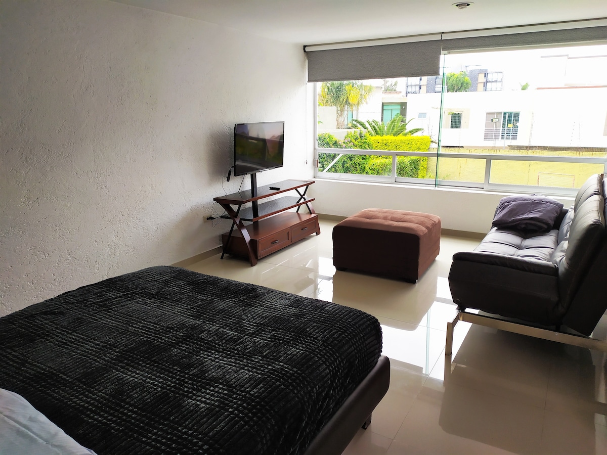 Hermoso departamento con terraza privada, internet alta velocidad; seguridad 24/7. A pie encuentras restaurantes, súper, lavandería, gym y coworking. A solo 2 min caminando de la UDLAP; cerca de la zona arqueológica, y el bello centro histórico de Cholula. A 5 min en coche están Explanada Puebla y Foro Cholula. Ubicado sobre la Recta a Cholula, con acceso directo al Centro Histórico de Puebla. Ideal para estancias largas o cortas. Ofrecemos facturación y descuentos por estadías largas.