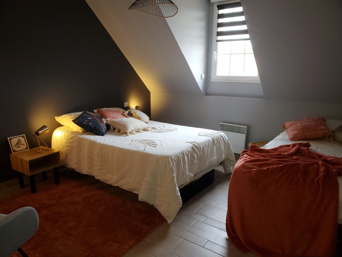 Our house is spacious and bright in a quiet area. We are from Sarthe and passionate about travel, meetings and exchanges. The house is decorated with souvenirs from our travels. Warm welcome in a family atmosphere. Your personal space has all the necessary equipment to make your stay as pleasant as possible. The Safari room is equipped with two 90x190cm beds, a desk, tea and coffee making facilities, and a lounge area. Your room offers you all the conditions for a good night's sleep (clean