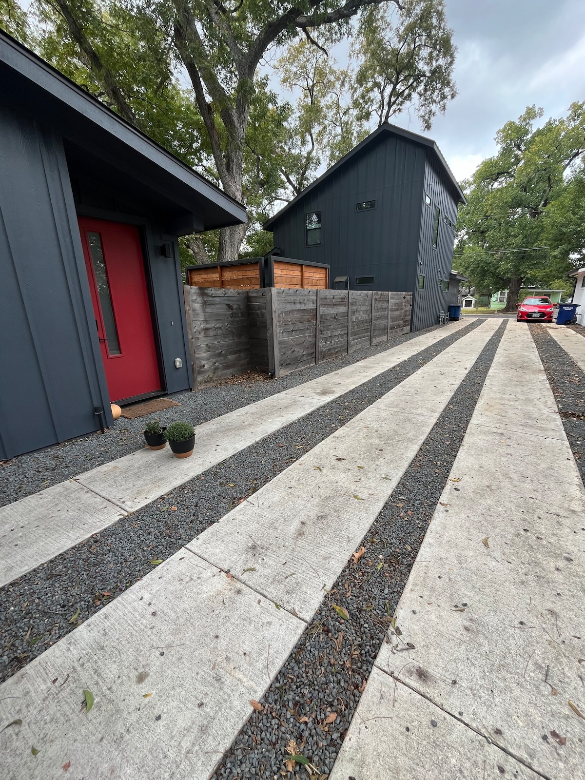 Guest house with private driveway and fence.