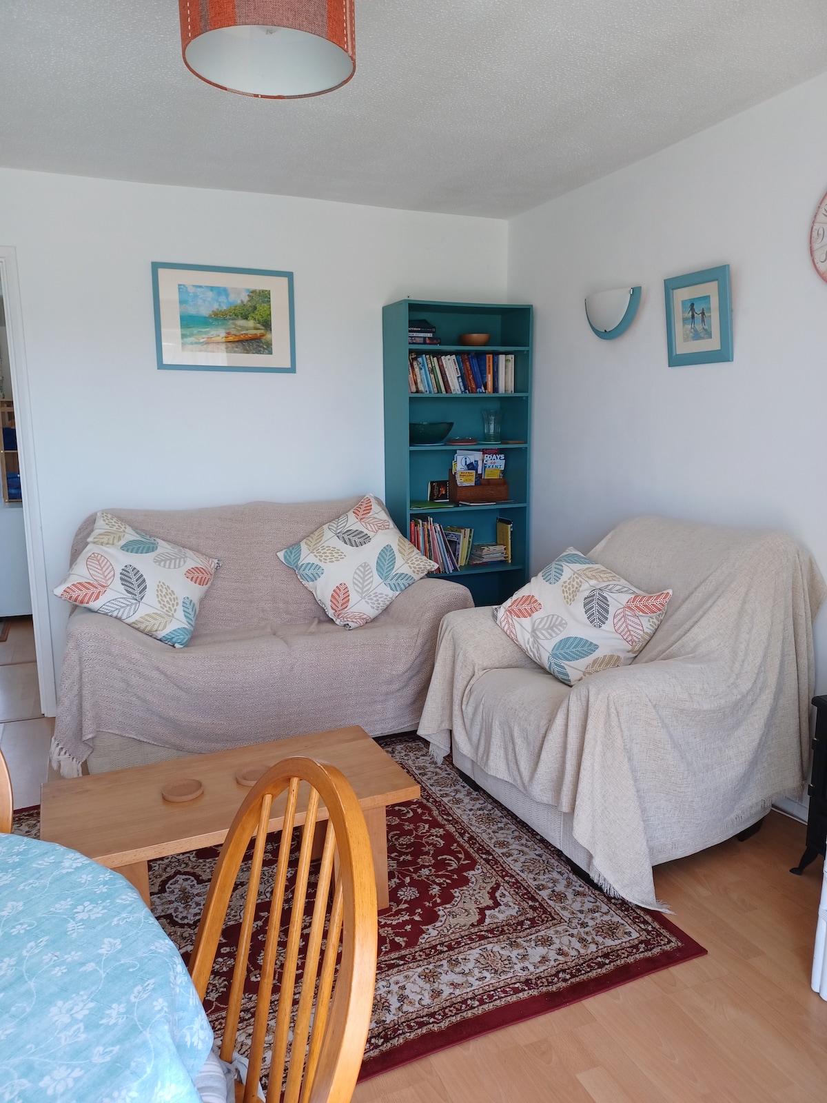Róleg og friðsæl íbúð með mikilli lofthæð og stórum gluggum sitt hvoru megin við stofuna sem gerir hana bjarta og rúmgóða. Stofan horfir út í sameiginlegan garð. Eldhúsið er fullbúið frá því að elda fulla ensku í morgunmat eða kvöldmáltíð. Það er borð og stólar til að borða á eða á bakka ef þú vilt borða í kjöltu þinni. Baðherbergið er með handklæði, sturtugel og salernisrúllur og svefnherbergið bíður þín til að hvíla þreytta höfuðið eftir að hafa séð þig í kringum Faversham
