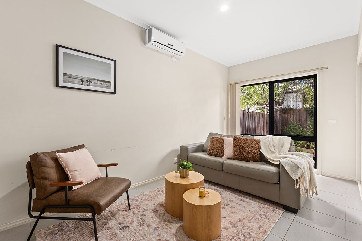 Verið velkomin í heillandi raðhúsið okkar í hjarta Oakleigh, VIC! Notalega afdrepið okkar býður upp á fullkomna blöndu af nútímaþægindum og þægindum fyrir dvöl þína í Melbourne. Þetta glæsilega raðhús með tveimur svefnherbergjum er með nútímalegum húsgögnum og hugulsamlegum atriðum. Stígðu inn í notalega rýmið þar sem dagsbirta flæðir inn um stóra glugga. Slakaðu á í einu af tveimur svefnherbergjunum, hvort um sig með mjúkum rúmfötum og mögnuðu útsýni, sem býður upp á frábært verð fyrir hópa með 4 eða færri.