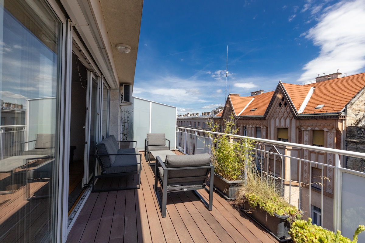 GUEST FAVOURITE AWARDED APARTMENT on Airbnb! Ideal for friends, families looking for unique stay at the winter and spring! Must-to-stay apartment in the middle of Budapest at a modern building: +Separated bedroom +Huge terrace with view +Fully equipped kitchen +Free, fast wi-fi Amazing services +Free parking +Free swimming pool +Free jacuzzi+sauna +Free gym Excellent location +Next to Andrassy ave. +Next to the Opera +Close to the SOHO +Sights are in walking distance HOSTED BY SUPERHOST
