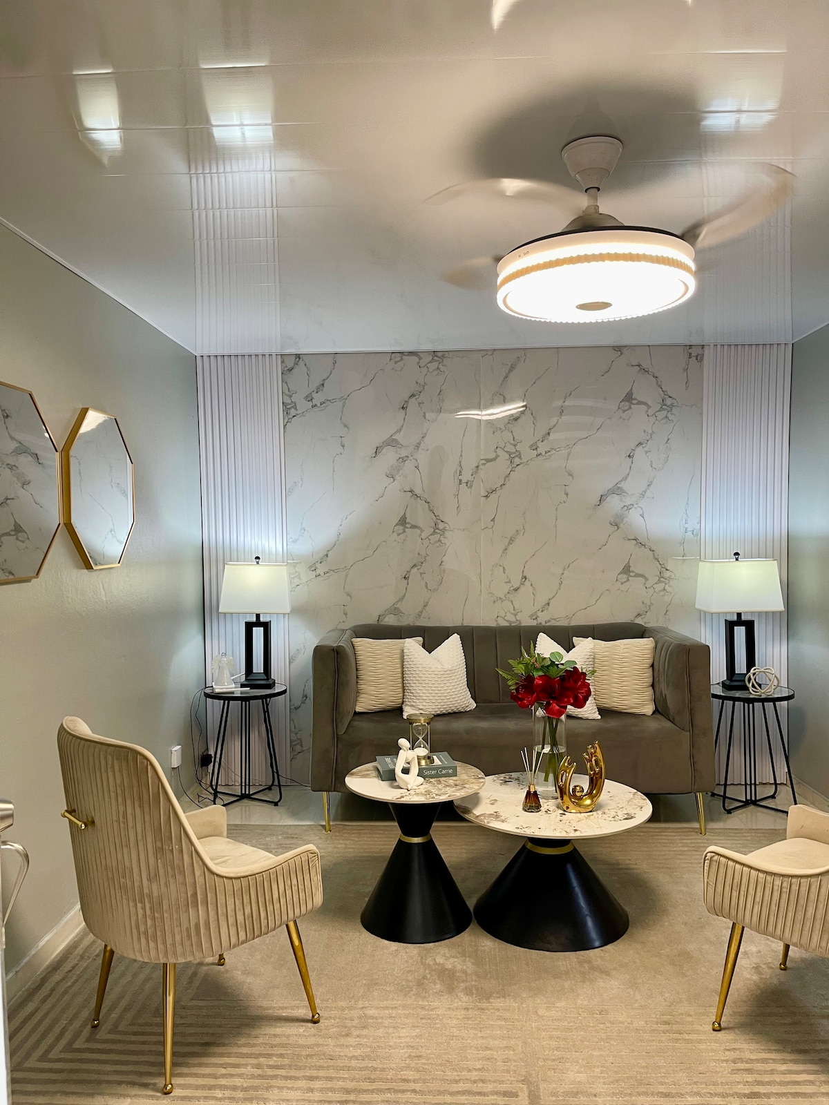 „Kynnstu kyrrðinni og stílnum á þessu nútímalega heimili sem býður upp á kyrrlátt og notalegt umhverfi sem hentar vel til afslöppunar. Stofan er búin þægilegum sófa og nútímalegum innréttingum. Baðherbergi að innan og utan eru lúxusafdrep með dökkum flísum og breiðri sturtu. Njóttu náttúrulegrar birtu og útsýnis yfir friðsæla verönd innandyra sem er fullkomin fyrir morgunkaffi eða síðdegislestur. Komdu og upplifðu einstaka upplifun á heimili sem er hannað með ástúð og stíl.“