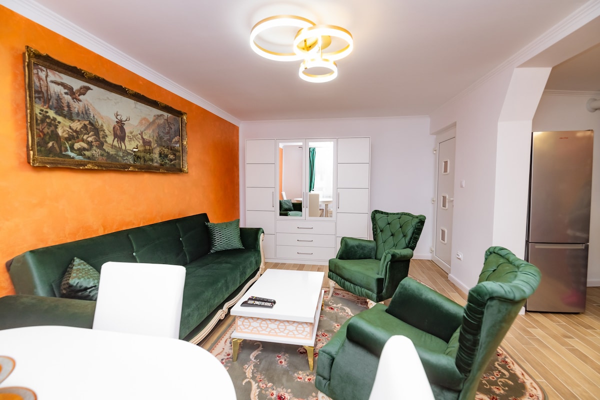 Domus Regis (King's House) bíður þín í táknborginni Great Union með stílhreina og fullbúna gistingu – í boði sem hótel • 3 aðskilin herbergi: 2 svefnherbergi með hjónarúmum + stofa með opnu eldhúsi og þægilegum svefnsófa • Fullbúið nútímalegt baðherbergi • Eigin upphitun, þráðlaust net, sjónvarp • Bílastæði innifalið • Rúmtak: Allt að 6 manns Verð: • 500 lei á nótt alla íbúðina • 300 lei/night-2 pers • 200 lei/nótt- 1 einstaklingur