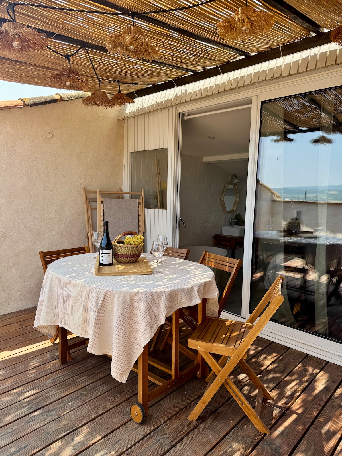 Appartement de 64m² dans maison de village traversante donnant sur vignes et gorges de l'Hérault. Proche du centre du village. Un escalier un peu raide permet d'accéder à une grande pièce à vivre ouverte sur un grand balcon/terrasse avec baie vitrée orientée est qui surplombe un jardin et une vigne, vue belle et dégagée. Coin salon (canapé convertible), coin salle à manger et cuisine ouverte. Au même niveau, chambre (lit double en 160) et salle de bain douche/wc. Résa Cybevasion & LBC possible