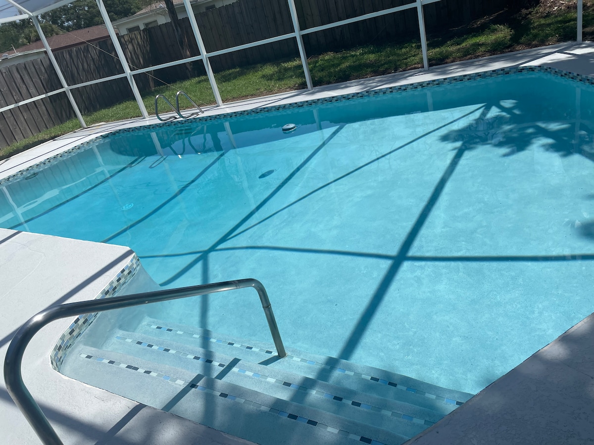 Þetta rúmgóða 4 herbergja heimili í Flórída er fullkomið fyrir fjölskyldu og vini! Staðsett í rólegu hverfi, nálægt öllu því sem Tampa Bay hefur upp á að bjóða. Aðeins 20 mínútur frá Clearwater Beach! Njóttu risastórrar stofu, fullbúins eldhúss, 2 King svíta og 2 svefnherbergja í viðbót þar sem 10 manns geta sofið vel! Syntu í stóru upphituðu lauginni (83°), slakaðu á við eldstæðið eða eldaðu á própangrillinu. Þér er velkomið að senda mér skilaboð ef þú hefur einhverjar spurningar. Ég hlakka til að taka á móti þér!