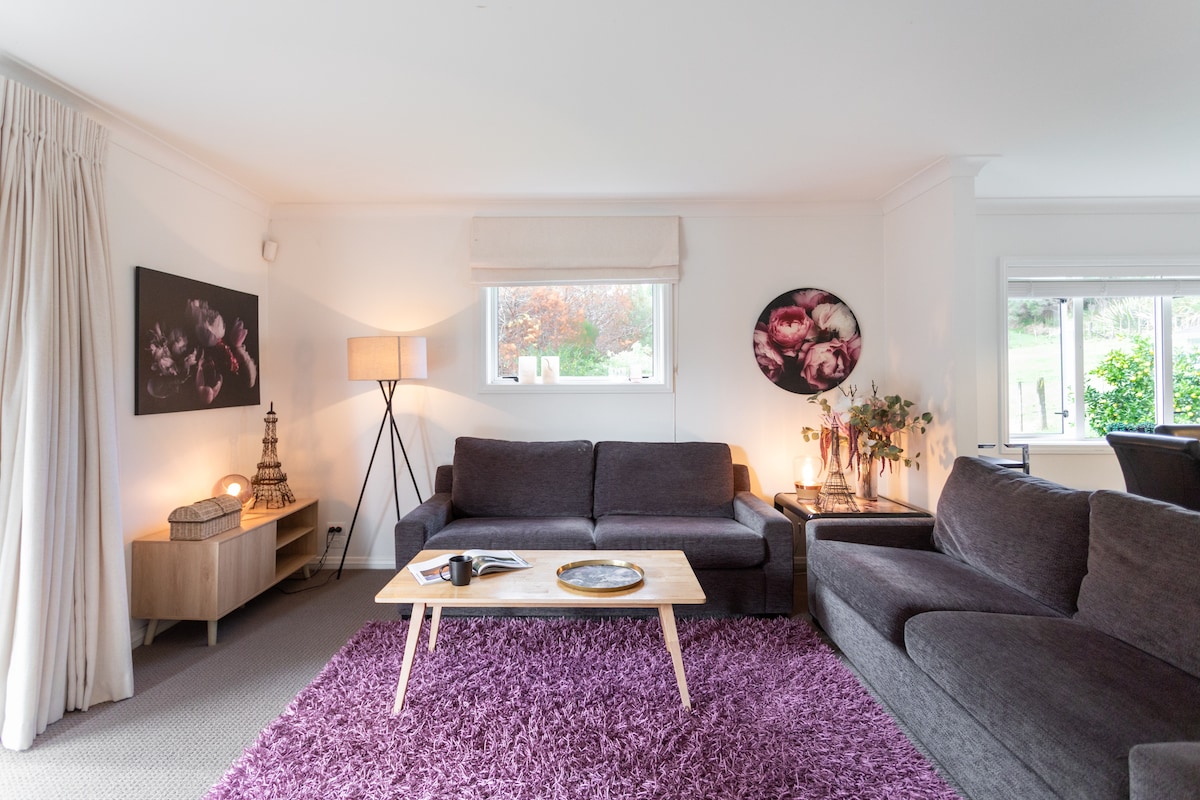 New build with amazing country views. Sit back and sip a wine and watch the sun go down while you rest and relax. Our park like grounds with english style gardens and friendly animals to talk to will help you unwind on our 60 acres. We have regional parks, black sand beaches, local tracks to ride your mountain bikes or take your kayak for a paddle within easy distance from our home. Pack a picnic and walk to our rock bottom stream or just enjoy a quiet country walk on our farmland.