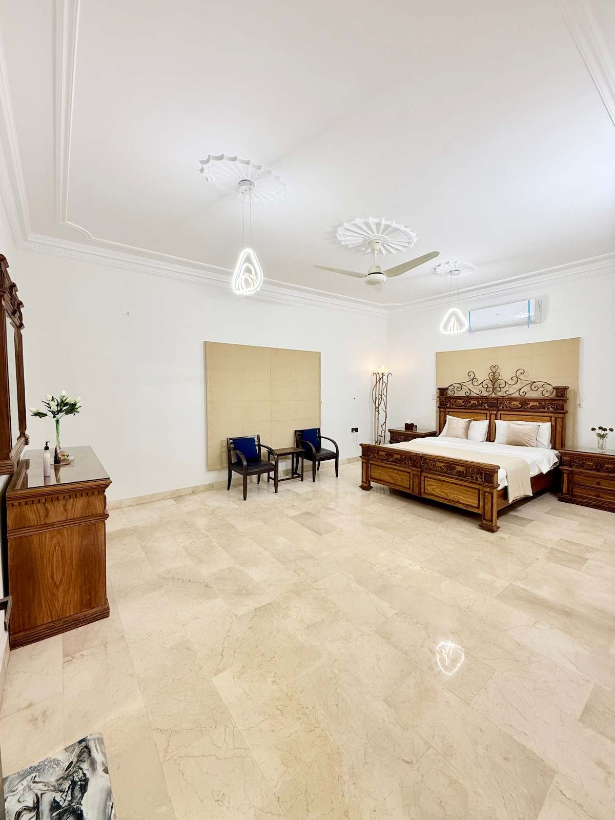 Welcome to Sapphire Suite – your cozy escape with a touch of luxury. Designed with midnight blue walls and elegant white furniture, this space offers a calm and stylish atmosphere. Enjoy movie nights with the projector, unwind in the chic living area. The suite also features a fully equipped kitchen, modern bathroom, and high-speed Wi-Fi. With 24/7 caretaker support and security, it’s perfect for families, couples, or business travelers looking for comfort and style in DHA.